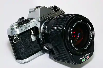 Pentax ME F — первый в мире малоформатный однообъективный зеркальный фотоаппарат с пассивной системой автофокуса на основе фазового оптического детектора, расположенного за объективом[1][2]. Производился в Японии с 1981 до 1988 года в чёрном и чёрно-серебристом исполнении. В тот же период другие фирмы только начинали оснащать свои камеры датчиками-подсказками верного положения фокуса[3], Asahi Optical первым выпустил фотоаппарат, который мог автоматически фокусировать объектив SMC Pentax AF Zoom 35—70/2,8. Остальная сменная оптика фокусировалась вручную по матовому стеклу видоискателя или по светодиодной и звуковой индикации системы автофокуса[4].