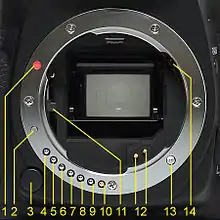 Если изолировать все контакты байонета, камера считает, что диафрагма установлена в наиболее открытое положение и затвор разблокируется. Подтверждение фокусировки работает только с объективами серий «F», «FA» и «D FA»[2].