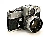 - Petri MF-2 — Резьба М42 для установки объективов. Для работы камеры используется две 1,5V серебряно-щелочных батареи S-76. Электромагнитный шторный затвор с горизонтальным движением матерчатых шторок и диапазоном выдержек от 4 до 1/1000 плюс В. Выдержка М 1/50 отрабатывается механически без элементов питания. Скорость синхронизации со вспышкой 1/60; Автотаймер 10 секунд; Светочувствительность выставляться в единицах ASA от 25 до 3200. Замер экспозиции двумя Cds фоторезисторами на рабочем значении диафрагмы. Замер экспозиции неполным нажатием на кнопку спуска затвора. Значения +/- и ОК для определения правильной экспозиции отображаются на ЖК дисплее в видоискателе. Видоискатель отображает 93% кадра.