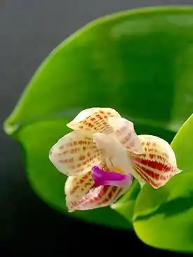 Цветки плотной текстуры, диаметром до 5 см, у некоторых экземпляров присутствует легкий фиалковый аромат. Фоновая окраска варьирует от белого до желтовато-зеленоватого или жёлтого, продольные полосы состоят из множества красно-коричневых точек.