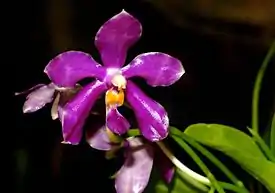 Цветки восковой фактуры, звездчатые, диаметром 4-6 см, ароматные, не увядают 2-3 недели. Лепестки продолговатые, в верхней части ровной фиолетовой, сине-фиолетовой или красной окраски с красивым поперечными черточками у основания, губа того же цвета, что и лепестки, с ярким жёлтым пятном в верхней части.