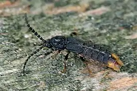 Усики заходят вершинами за основание переднеспинки. Глаза самца небольшие. Крылья отсутствуют. Надкрылья самца едва достигают первого тергита брюшка, у самки отсутствуют вовсе[1].