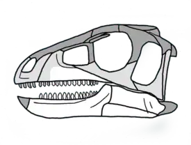![]() Реконструкция черепа. Белым цветом обозначены сохранившиеся кости; светло-серым цветом обозначены кости, известные по сильно размытым отпечаткам | ||||||