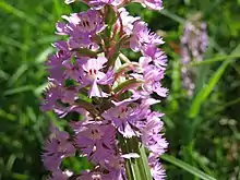 Соцветие — колос с 25—50 (или более) обычно густо расположенными цветками. Цветки приметные, декоративные, ароматные, розово-сиреневого цвета, изредка белые, 12—15 мм в диаметре. Боковые чашелистики изогнутые. Лепестки лопатчатой или широко-обратнояйцевидной формы, с бахромчатым краем. Губа разделена на три вееровидные бахромчатые лопасти, шпорец до 2 см длиной, тонкий, с утолщением на конце.