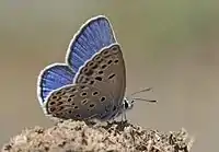 Половой диморфизм выражен у всех представителей рода. Верхняя сторона крыльев у самцов блестящяя синяя или фиолетово-синяя. У самки верхняя сторона крыльев бурая, часто с выраженным синим опылением у корней крыльев. В центральной ячейке на нижней стороне крыльев пятна отсутствуют. Одно или более чёрных пятен прикраевого ряда на нижней стороне задних крыльев центрированы блестящими голубыми чешуйками. Глазами покрыты короткими редкими волосками. Булава усиков состоит из 16 члеников. Копулятивный аппарат самцов характеризуется относительно длинным, тупоугольно-срезанным эдеагусом, его конец уплощен и слегка расширяется к вершине[1][2].