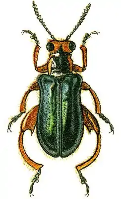 Надкрылья металлически-синие.Задние бёдра у самцов с крупным, у самки с небольшим зубцом за серединой, без предвершинных зубцов. Переднеспинка без острого бугра на боковом крае.[1]