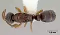Муравьи коричнево-чёрного цвета (около 3 мм). Отличаются тёмной окраской и сравнительно крупными размерами (длина головы 0,65 мм, ширина головы 0,53 мм). Клипеус, жвалы, усики и ноги желтоватые. Усики рабочих и самок 12-члениковые. Скапус затылка не достигает. Нижнечелюстные щупики 2-члениковые, нижнегубные щупики состоят из 2 сегментов (формула щупиков 2,2). Голова вытянутая. Глаза относительно крупные для рода, оцеллии у рабочих отсутствуют (у самок есть). Жвалы треугольные, лобные валики отсутствуют. Стебелёк между грудкой и брюшком состоит из одного массивного членика (петиоль), узелок петиоля толстый. Гнёзда в почве и гнилой растительности[1]. Вид был впервые описан в 1906 году американским мирмекологом Уильямом Уилером по материалам из Японии[3].