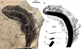 Соотношение концентраций стабильных изотопов углерода в образце свидетельствуют о животном, а не растительном происхождении окаменелости. По первоначальному составу это «протоперо» могло быть близким к роговым производным кожи (которыми являются чешуи и перья)[3]. В отличие от перьев современных птиц и перьев динозавров, данное «перо» имеет не две плоскости волосков-бородок, отходящих от центрального стержня, а три. При этом сам стержень имеет не круглую, а овальную форму сечения. Одна из плоскостей находится непосредственно под другой и она меньше остальных. Центральный стержень весьма толст, а между бородками отсутствуют какие-либо дополнительные бородки и крючочки, имеющиеся в перьях современных птиц[3].