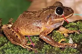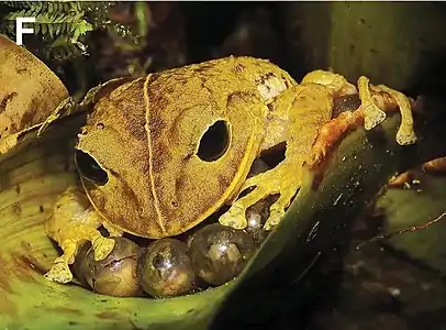 Характеризуется следующим сочетанием признаков: 1) дорсальные кожные поверхности слегка ячеистые, с рассеянными бугорками; вентральная сторона слабо дифференцирована; имеется дисковидная складка, дорсолатеральные складки отсутствуют; (2) барабанная перепонка скрыта, плохо различима; барабанная перепонка у самцов едва заметна, у самок не видна; барабанная складка простирается от заднего края глаза до места прикрепления руки; 3) рыло короткое, широко округлое при виде сверху, умеренной длины, округлое и слегка выступающее в профиль; (4) верхнее веко с одним коническим или шиповидным бугорком треугольной формы; черепные гребни отсутствуют; 5) зубные отростки имеются, выпуклые, косые, на каждом от 5 до 10 зубов; (6) голосовые щели и брачные подушечки отсутствуют[1].