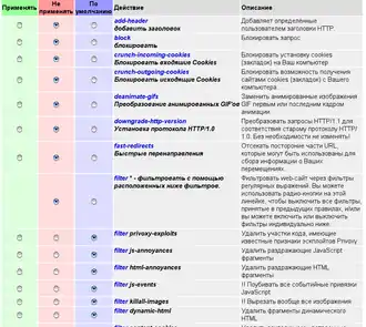 - Простыми. Это действия, алгоритм которых задан жёстко непосредственно в исходном коде Privoxy и не может быть изменён без модификации и перекомпиляции исходного кода
