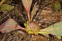 Цветки опыляют крысы, мыши и птицы. Семена сохраняются в высушенных огнестойких соцветиях (семенных головках), которые остаются прикрепленными к растению, и высвобождаются только после пожара через 1-2 года после цветения, причем распространение происходит под действием ветра[6][8].