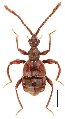 Мелкие жуки-ощупники, длина тела около 3 мм, красновато-коричневого цвета. Голова длиннее своей ширины, задняя часть щёк округлая. Передние голени с апикальным шипиком. Средний вертлуг с 2 мелкими шипиками. Пронотум угловатый на переднебоковых углах с крупным метавентральным выступом. Апикальные членики IX—XI жгутика усика увеличенные (IX членик модифицированный с переднебоковым выступом). Глаза примерно из 45 фасеток. Второй тарзомер простой, линейный, не увеличенный. Срединная метавентральная ямка отсутствует. Нижнечелюстные щупики (по крайней мере, некоторые сегменты из группы II—IV) асимметричные, округло расширенные или слегка выступающие латерально. Голова с фронтальной ямкой. Глаза выступающие. Усики прикрепляются у переднего края головы; булава усиков 3-члениковая; скапус отчётливо длиннее педицелля. Ноги тонкие и длинные; бёдра утолщённые. В основании надкрылий по две ямки. Брюшко короткое (его длина явно меньше ширины)[1][3][2].