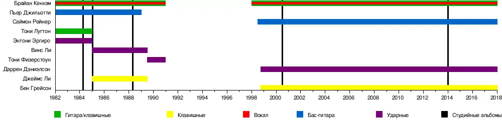 - Брайан Кенхэм — вокал, гитара, клавишные (1982-1990, 1998-наши дни);