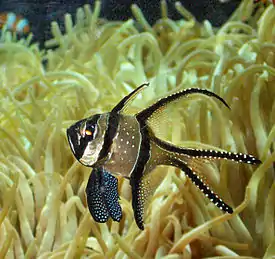 Тело овальное, высокое серебристого, бело-серого окраса с длинными, вытянутыми плавниками. Длина тела составляет 8 см. По телу проходят две большие, чёрные поперечные полосы. Первая начинается у основания спинного плавника и заканчивается у брюшного плавника. Вторая начинается у основания второго очень длинного спинного плавника и заканчивается у анального плавника. На голове поперечная полоса проходит по большим глазам. Вилочковый хвост имеет две продольные чёрные полосы. Первый спинной плавник имеет 8 жёстких лучей, второй — 14 мягких лучей. Анальный плавник начинается двумя жёсткими и поддерживается 13 мягкими лучами[1]. Все плавники, боковые стороны между поперечными полосами и стебель хвоста имеют рисунок из белых пятен, индивидуальный у каждой особи[2]. Половой диморфизм отсутствует.