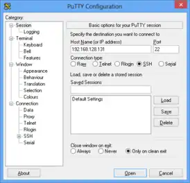 PuTTY (/ˈpʌti/[2], Пати) — свободно распространяемый клиент для различных протоколов удалённого доступа, включая SSH, Telnet, rlogin. Также имеется возможность работы через последовательный порт.