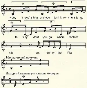 Своеобразие песне придаёт вторая часть (отдел B в полной версии формы), каждая строфа которой заканчивается рефреном Puttin' on the Ritz. Здесь простейшая мелодическая фигура (квартсекстаккорд в тесном расположении) проводится четырежды (см. нотный пример), каждый раз иначе ритмизованная. Первое проведение устанавливает исходный мелодико-ритмический вариант («точку отсчета», ноты фигуры синхронизированы с долями метрической сетки). Все последующие проведения фигуры ритмически сокращены (три восьмых вместо четырёх), при этом метрические акценты падают на разные ноты фигуры: во втором проведении — акцент на d (№ 2 на схеме мелодического прототипа) со смещением на шестнадцатую (синкопа), в третьем — на f (№ 3), в четвёртом — на a (№ 4). Изобретательная мелодико-ритмическая игра создаёт впечатление сбоя в тактовом метре (так называемая ложная полиметрия), который в действительности строго выдерживается на всём протяжении пьесы.