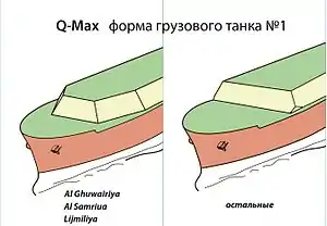 Q-Max имеет пять мембранных танков системы Gas Transport-Technigas общей вместимостью от 261 700 м 3 до 267 335 м 3. У танкеров Al Ghuwairiya, Al Samriya и Lijmiliya — танки типа GTT NO96 , у остальных — типа TGZ Mark III.[4] Визуально эти три танкера легко отличить от остальных из серии по форме грузового танка №1.