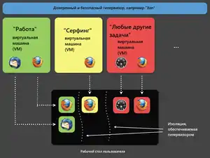 Qubes OS — ориентированная на безопасность настольная операционная система, которая призвана обеспечить безопасность через изоляцию[6][7][8]. Виртуализация осуществляется на базе Xen. Пользовательская среда может быть основана на Fedora, Debian, Whonix, Windows и других операционных системах[9][10].