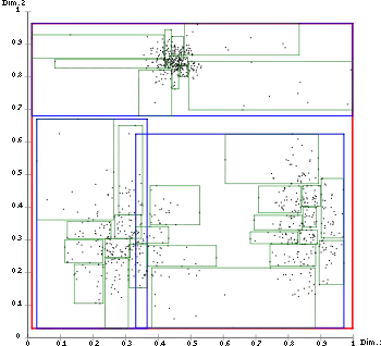 - Для разбиения R*-дерево использует топологическое разбиение, которое выбирает разбиение осей по периметру, затем минимизируется перекрытие.