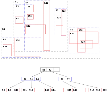 Эта структура данных разбивает многомерное пространство на множество иерархически вложенных и, возможно, пересекающихся, прямоугольников (для двумерного пространства). В случае трехмерного или многомерного пространства это будут прямоугольные параллелепипеды (кубоиды) или параллелотопы.