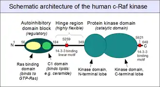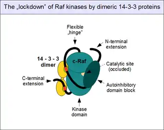 Белок 14-3-3 также вносит вклад в аутоингибирование c-Raf. Известно, что белки 14-3-3 образуют димеры и, таким образом, имеют два связывающих участка[33]. За счёт этого димер 14-3-3 действует как «молекулярный замок», удерживая потенциально связывающие белки-партнёры на безопасном расстоянии и ориентации от c-Raf. Таким образом, димер 14-3-3 (в частности 14-3-3ζ), будучи вовлечён во взаимодействие с c-Raf, запирает киназу в «закрытом» состоянии и не позволяет разделение аутоингибирующего и каталитического доменов белка[34]. Такое «запирание» c-Raf, как и других представителей Raf и KSR, контролируется фосфорилированием 14-3-3-связывающего мотива на «шарнирном» участке белка. Оно невозможно без предварительного фосфорилирования определённых серинов (у c-Raf человека — это серины 259 и 621) другими протеинкиназами. Наиболее важной из этих киназ является MAP3K7/TAK1, а ферменты, отвечающие за дефосфорилирование этих аминокислот — фасфатаза PP1 и фосфатазный комплекс PP2A[35][36].