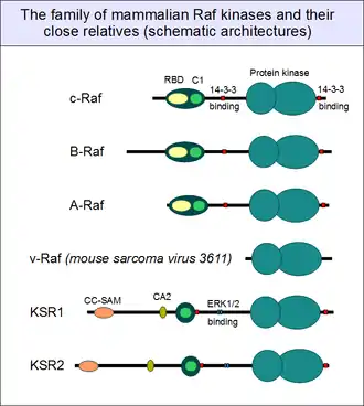 Многоклеточные организмы имеют тип киназы близкородственный с Raf — киназный супрессор Ras (KSR). У позвоночных животных два паралога гена KSR: KSR1 и KSR2. Их C-концевой киназный домен похож на таковой у Raf, однако регуляторный N-терминальный домен у них отличается. Хотя у KSR тоже есть шарнирный регион, у него отсутствует Ras-связывающий домен. Вместо последнего расположен уникальный регуляторный домен CA1. Структура была раскрыта в 2012 году и содержит домен SAM-мотив с добавочной двуспиральной областью (coiled coil), т. н. CC-SAM, который помогает белкам KSR при мембранном связывании[26]. KSR, так же, как и Raf, содержат двойной мотив связывания с белками 14-3-3, требующий фосфорилирования, но, кроме этого, они содержат на шарнирном участке другие MAPK-связывающие мотивы. Типичная последовательность последних, -FxFP-, играет важную роль в регуляции Raf-киназ в сигнальных путях ERK1/2. KSR участвуют в тех же сигнальных путях, что и киназы Raf, но играют пти этом второстепенную роль. Их внутренняя киназная активность настолько низкая, что долгое время они считались неактивными[27][28]. Их роль в фосфорилировании несущественна и, по-видимому, в основном KSR являются партнёрами в гетеродимеризации с киназами Raf, значительно активируя их за счёт аллостерического эффекта. Подобные эффекты были описаны и для других MAP3K киназ. Например, ASK2 обладает низкой ферментативной активностью сам по себе и его действие связано с образованием гетеродимера ASK1/ASK2[29].