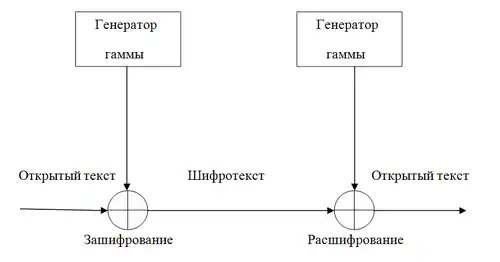 - Поток битов ключа складывается с шифрограммой () операцией «xor». В силу свойств операции «xor» на выходе получается исходный (незашифрованный) текст ():