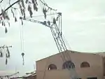 - По железной дороге. При перевозке по железной дороге кран должен быть разобран на отдельные укрупнённые узлы (в соответствии с нормами железных дорог по габаритам) и транспортируют на платформах в разобранном виде. Кран транспортируется со снятой стрелой, укосина опускается в нижнем — транспортном положении. Кабину управления также необходимо снимать. Размещение и крепление которых узлов на железнодорожных платформах и полувагонах должно производиться в соответствии с чертежами и расчётами крепления, утверждёнными в установленном порядке. При этом руководствуются «Техническими условиями погрузки и крепления грузов»[1].