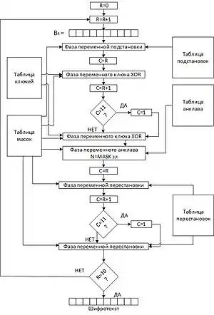 Выбирается байт из данных и соответствующий байт из таблицы масок, между которыми осуществляется операция XOR. Полученное значение, взятое по модулю 16 — номер таблицы подстановок. Все байты, за исключением выбранного, заменяются значениями из таблицы подстановок с полученным номером.