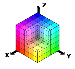 Для большинства приложений значения координат r, g и b можно считать принадлежащими отрезку [0,1], что представляет пространство RGB в виде куба 1×1×1.