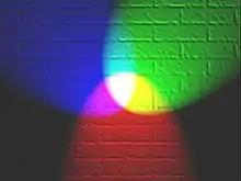 RGB-модель является аддитивной, где цвета получаются путём добавления к чёрному цвету. При отсутствии излучения — нет никакого цвета — чёрный, смешение всех трёх в определённой пропорции — даёт белый. Если цвет экрана, освещённого цветным прожектором, обозначается в RGB как (r1, g1, b1), а цвет того же экрана, освещённого другим прожектором, — (r2, g2, b2), то при освещении двумя прожекторами цвет экрана будет обозначаться как (r1+r2, g1+g2, b1+b2).