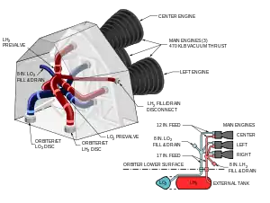 Окислитель от внешнего топливного бака поступает в орбитальный аппарат на стыковочное соединение челнока с внешним баком и затем в главную систему подачи жидкого кислорода челнока. Там она разветвляется на три канала, по одному для каждого двигателя. В каждой ветви предварительный клапан жидкого кислорода должен быть открыт, чтобы обеспечить поток к бустерному ТНА окислителя (англ. Low Pressure Oxidizer Turbopump, LPOTP).
