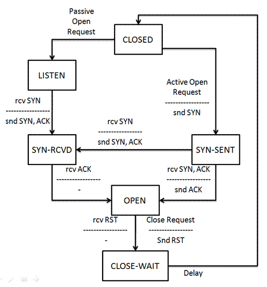 Изначально соединение пребывает в состоянии CLOSED, то есть не существует. Выход из этого состояния осуществляется по запросу на открытие соединения. Запрос может быть активным либо пассивным. После запроса на открытие и успешного обмена сегментами SYN и ACK между узлами соединение переходит в состояние OPEN. В этом состоянии осуществляется пересылка пользовательских данных. Выход из него происходит при получении запроса на закрытие соединения или сегмента RST. При получении сегмента RST соединение после некоторой задержки закрывается. При получении запроса на закрытие узел отправляет сегмент RST, и только после этого происходят задержка и закрытие соединения.