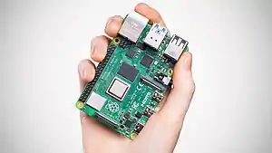 Raspberry Pi (['rɑːzbərɪ paɪ], Ра́збери па́й) — одноплатный компьютер размером с банковскую карту, изначально разработанный как бюджетная система для обучения информатике, но позже получивший более широкое применение и известность. Разрабатывается британской компанией Raspberry Pi Foundation[6][7] во главе с Эбеном Аптоном. По состоянию на конец 2019 года было продано более 30 миллионов устройств Raspberry Pi[3].