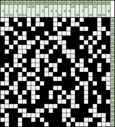 - Ограниченность ресурсов: для изготовления шаблона использовалось 36 различных готовых шаблонных рядов с 10 пустыми клетками в каждом. Из них было необходимо изготовить трафарет, состоящий из 24 строчек. Это приводило к повторам в новых экземплярах шаблонов[24][25].