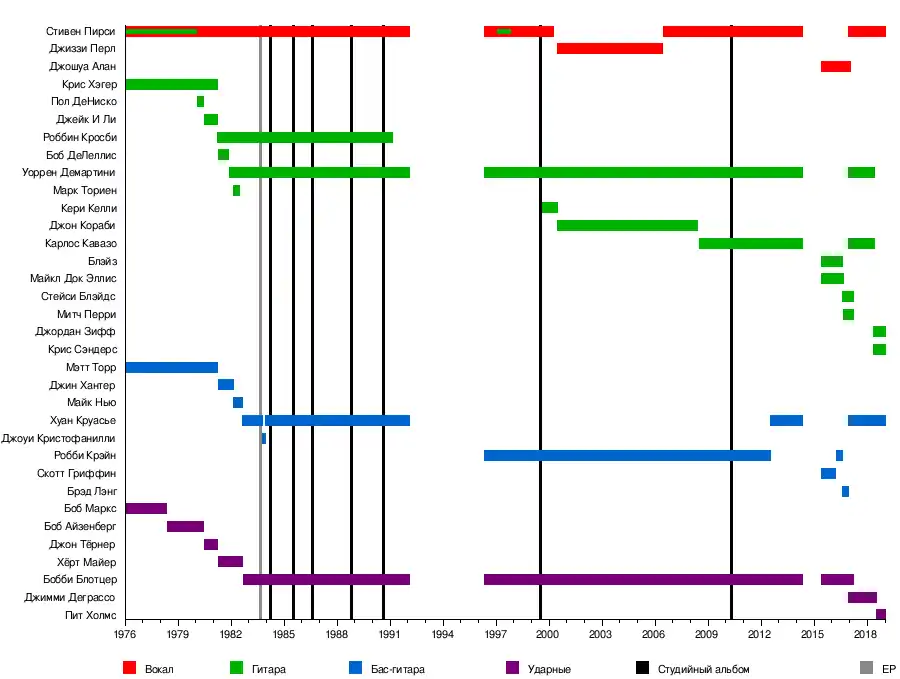 - Хуан Краусье (Juan Croucier) — бас-гитара, бэк-вокал (1982—1983, 1983—1992, 2012—2014, 2016—наши дни)