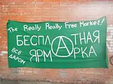 Фримаркеты (Really Really Free Market) — движение, зародившееся в США в 2004 году и распространившееся по всему миру, организующее в городских парках периодические «рыночные дни» (market days), в ходе которых участники отдают даром ставшие ненужными им товары, еду, а также свои таланты (развлечение, стрижка посетителей и т. д.). Таким образом члены движения противопоставляют себя капиталистическому обществу ненасильственными методами. Анархисты намекали, что именно у них рынок действительно свободен, в отличие от т. н. свободных рыночных отношений, которое декларирует бизнес-элита. Участники должны убрать после себя и забрать домой всё, что не смогли раздать.