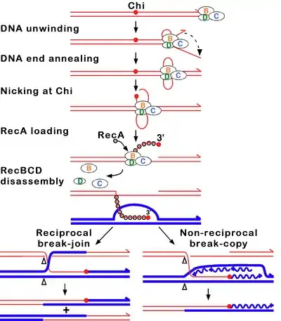 При обоих условиях реакции 3'-конец остается интактным после Chi-сайта, рядом с которым идет активная загрузка белка RecA на цепь ДНК. В какой-то неопределённый момент RecBCD распадается, хотя может расплести по крайней мере 60 тысяч пар оснований ДНК, оставаясь целым. RecA инициирует обмен нитями ДНК с идентичной или почти идентичной молекулой-матрицей; этот обмен создает структуру, известную как D-петля. Образовавшаяся структура из двух ДНК-дуплексов с перекрещенными нитями может быть разрешена двумя способами: либо внедренная в матричную молекулу 3'-нить с Chi-сайтом послужит праймером для начала синтеза ДНК, либо произойдет расщепление D-петли с образованием структуры Холлидея. В свою очередь, структура Холлидея разрешается комплексом RuvABC или посредством белка RecG. Каждое из этих событий ведет к появлению целой ДНК, которая отличается от родительских новыми комбинациями генов. Этот процесс, известный как гомологичная рекомбинация, завершает репарацию двухцепочечного разрыва[13].