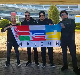 ![]() RED в Минске с подарком фанатов. Слева направо: Майкл Барнс, Рэнди и Энтони Армстронги, Дэн Джонсон | |