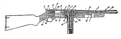 Для автоматического перезаряжания в этом оружии использовалась энергия отдачи полусвободного затвора. В крайнем переднем положении затвор своей тыльной частью заходил в специальный скошенный уступ во внутреннем канале ствольной коробки, и за счёт этого перекашивался вверх. В момент выстрела, когда он начинал отходить от ствола назад под действием давления пороховых газов на донце гильзы, упором в этот уступ его движение несколько замедлялось. После того, как тыльная часть затвора миновала этот уступ, соскользнув вниз, затвор отходил в заднее положение свободно.