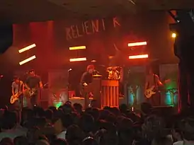 ![]() Концерт Relient K в Мае 2007 года. Слева направо: Джонатан Шнек, Мэтт Хупс, Мэтт Тиссен, Дэйв Дуглас, Джон Уорн | |