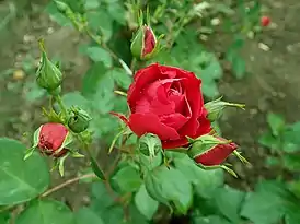 Цветки около 7,5 см в диаметре, яркие, алые, с умеренным ароматом, около 30 лепестков. Пыльники жёлтые.