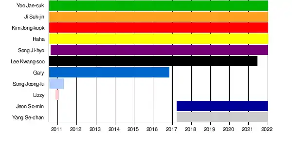 1-по н.в. — постоянный участник | 1972 г.р. Женат, есть сын и дочь. МС, ведущий, комик. Главный ведущий шоу. Благодаря своему интеллекту и харизме, Ю Дже Сок один из самых популярных участников шоу. Известен тем, что ему удается вырваться из самых сложных ситуаций. Наряду с Ким Джон Куком, считается одной из двух основных сил в гоночных миссиях. Его тематические песни «Step by Step» от New Kids on the Block и «Extreme Ways» от Moby. Его официальный цвет — зелёный. Его животное — кузнечик. |