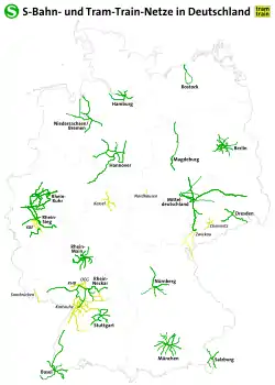 Первый S-Bahn был открыт в Берлине в декабре 1930 года. В Германии S-Bahn является подразделением немецких железных дорог (Deutsche Bahn AG). Некоторые крупнейшие аэропорты страны также связаны с их городами маршрутами S-Bahn. В настоящее время Германии существует семнадцать[5] систем S-Bahn, многие из которых обслуживают сразу несколько городов: