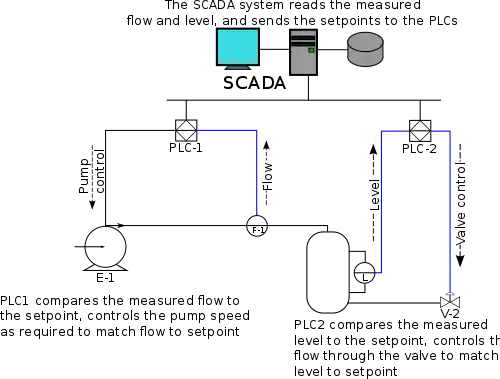 Термин SCADA обычно относится к централизованным системам контроля и управления всей системой, или комплексами систем, осуществляемого с участием человека. Большинство управляющих воздействий выполняется автоматически УСО (RTU) или ПЛК (PLC). Непосредственное управление процессом обычно обеспечивается RTU или PLC, а SCADA управляет режимами работы. Например, PLC может управлять потоком охлаждающей воды внутри части производственного процесса, а SCADA система может позволить операторам изменять уставки для потока, менять маршруты движения жидкости, заполнять те или иные ёмкости, а также следить за тревожными сообщениями (алармами), такими как — потеря потока и высокая температура, которые должны быть отображены, записаны, и на которые оператор должен своевременно реагировать. Цикл управления с обратной связью проходит через RTU или PLC, в то время как SCADA система контролирует полное выполнение цикла.