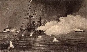 ![]() «Ариадне» под огнём британских линейных крейсеров, 28 августа 1914 |
