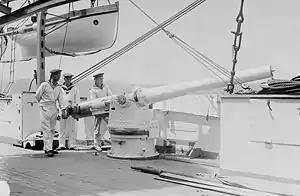Вооружение крейсера составляли десять 105 мм скорострельных орудий системы SK L/40 на одиночных опорах, Два орудия были размещены рядом на носу, шесть вдоль бортов по три на каждом борту и два бок о бок на корме. Орудия имели прицельную дальность в 12.200 м. Общий боезапас оставлял 1.500 выстрелов, по 150 выстрелов на орудие. Также корабль вооружён двумя 450 мм торпедными аппаратами с пятью торпедами. Аппараты были установлены в корпусе судна по бортам под водой[3]. Корабль был защищён бронированной палубой толщиной до 80 мм. Толщина стен рубки составляла 100 мм, орудия были защищены тонкими щитами 50 мм толщины[2].