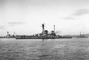![]() «Гинденбург» (в центре) и «Дерфлингер» (слева сзади) в Скапа-Флоу, 1919 год |