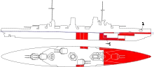 Подводная защита обеспечивалась вертикальной противоторпедной переборкой, отстоящей от борта на 4 м на миделе. Переборка имела толщину 30 мм, увеличиваясь до 50 мм в районе погребов боезапаса, и заканчивалась 20-мм поперечными переборками. Между бронированной и верхней палубами она продолжалась как противоосколочная и имела толщину 30 мм[13][11][7][8]. Дополнительную конструктивную защиту обеспечивали угольные бункеры, расположенные между бортом и противоторпедной переборкой.