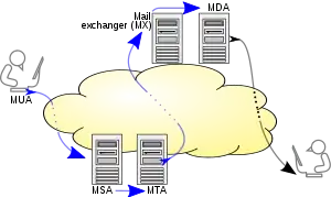 Электронная почта представлена почтовым клиентом (MUA, mail user agent — пользовательский почтовый агент) для почтового сервера (MSA, mail submission agent — агент отправки электронной почты) с помощью SMTP по TCP-порту 587. Оттуда MSA доставляет почту своим агентам передачи сообщений (MTA, mail transfer agent). Часто эти два агента являются просто различными образцами одного и того же программного обеспечения, запущенного с разными параметрами на одном устройстве. Локальная обработка может быть проведена как на отдельной машине, так и разделена между различными устройствами; в первом случае вовлечённые процессы имеют общий доступ к файлам, во втором случае SMTP используется для пересылки сообщения внутренне, причём каждый хост настроен на использование следующего устройства в качестве промежуточного хоста. Каждый процесс — сам по себе MTA, то есть — SMTP-сервер.